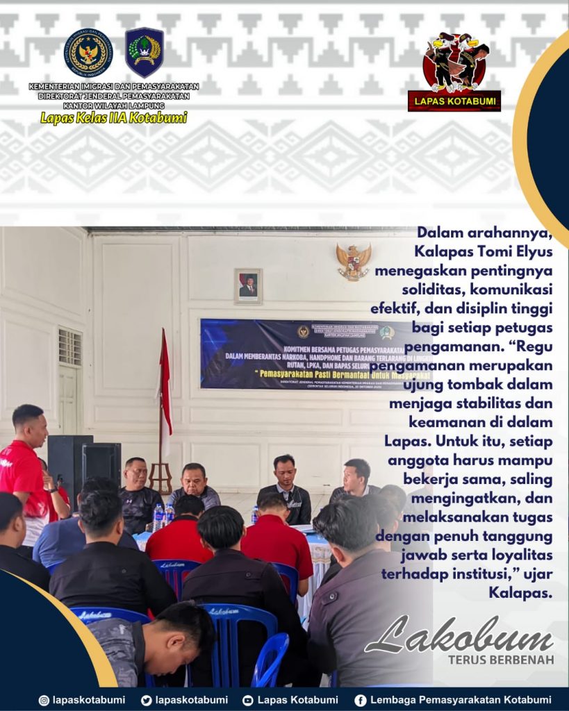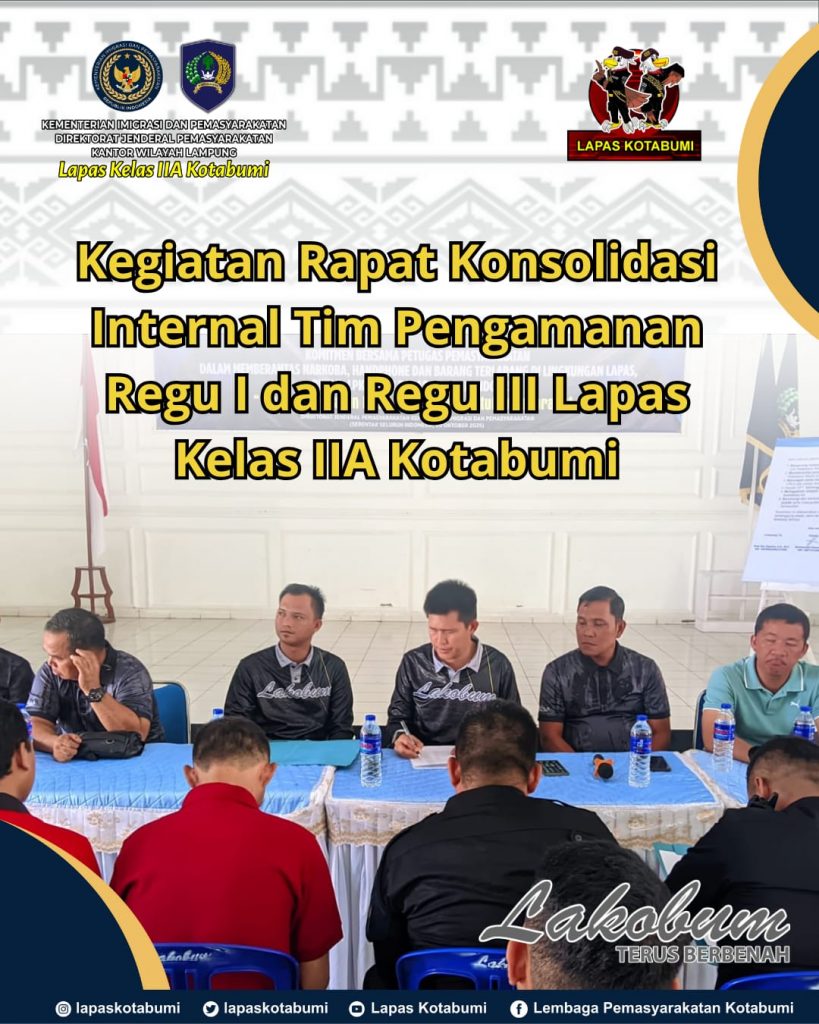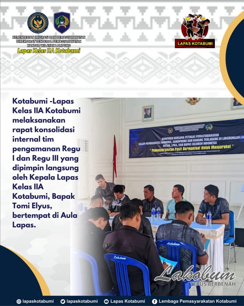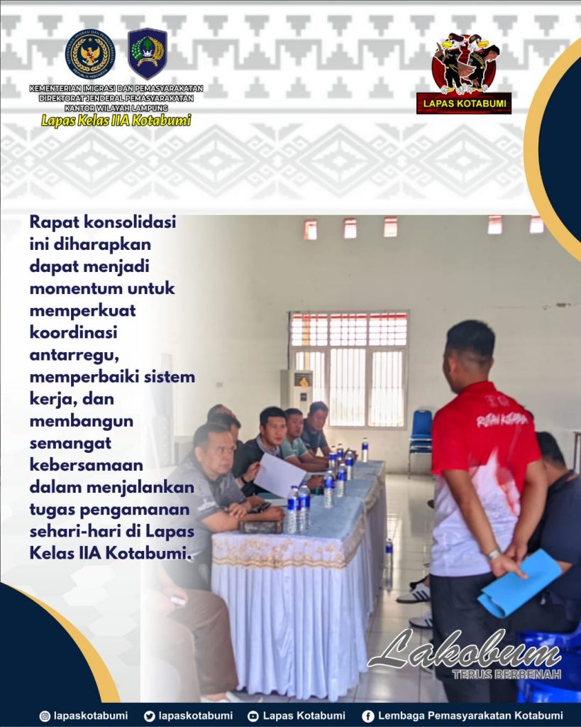 Kotabumi -Lapas Kelas IIA Kotabumi melaksanakan rapat konsolidasi internal tim pengamanan Regu I dan Regu III yang dipimpin langsung oleh Kepala Lapas Kelas IIA Kotabumi, Bapak Tomi Elyus, bertempat di Aula Lapas.
